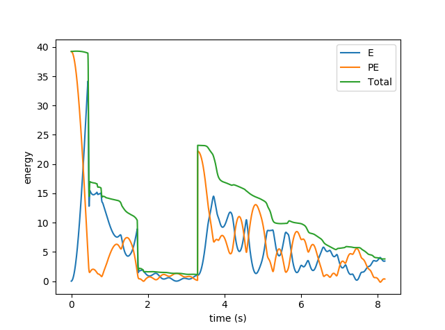 command line option) simulation pops up a plot for the simulation's energy over time. This isn't interactive right now, but it gives an idea of how accurate the simulation is (not very!), and shows how kinetic and potential energy are traded off against one another.