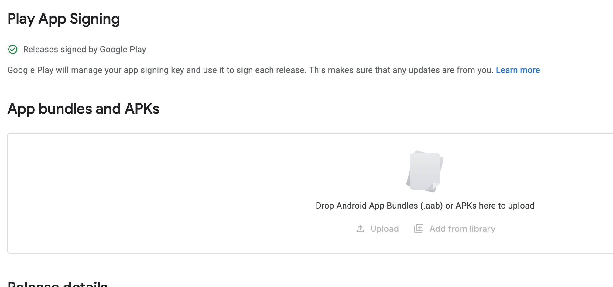 KEY_PASSWORD=<alias password>You will need to upload the bundle manually the first time. Create the app in the Play Store console and then set the Application ID in the android/app/build.gradle file: