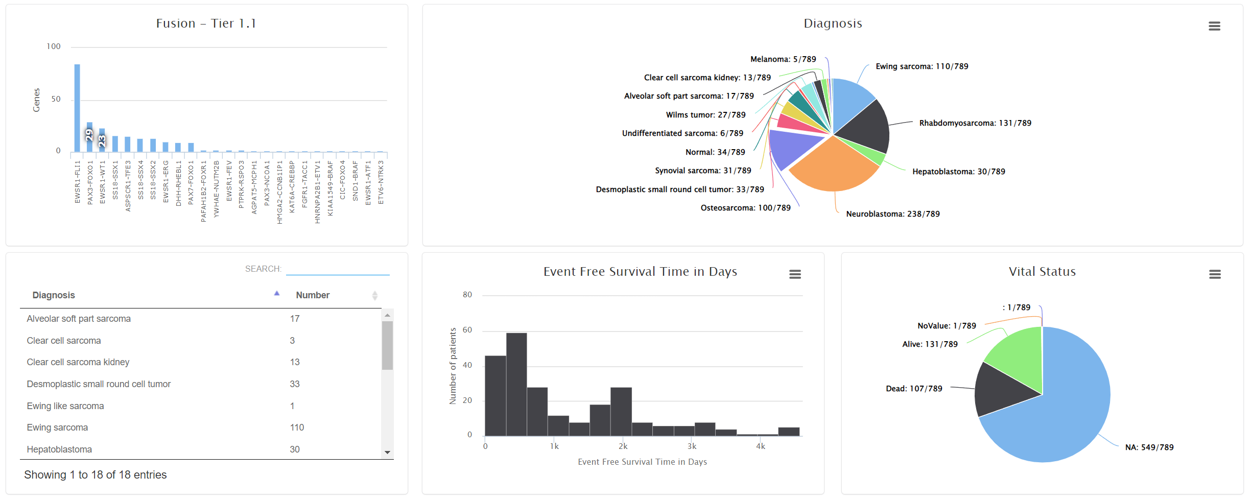 The summary tab shows the meta data statistics. Oncogenomics automatically determines if the data types is categorical or numeric and shows bar chart or pie chart respectively. If the project has diagnoses >= 10, a sortable table will be displayed.
