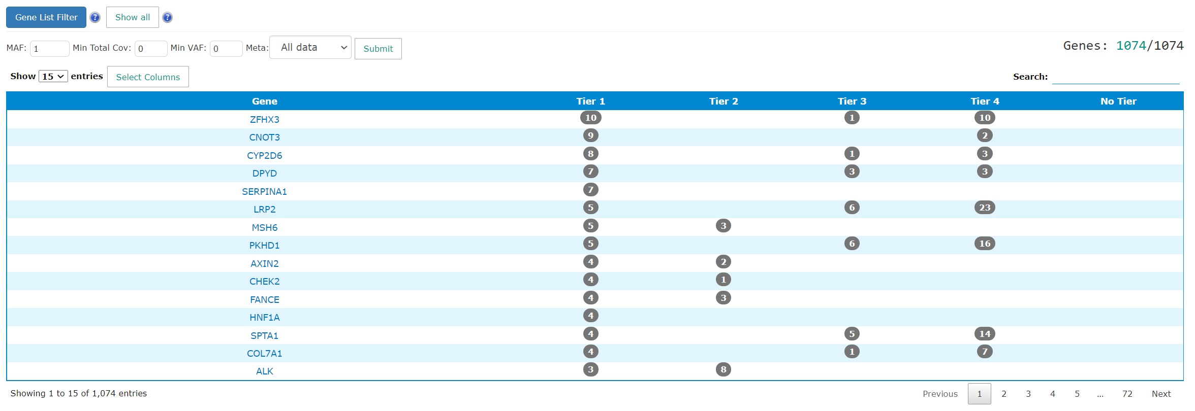 The summary table includes the gene name and the patient count for each tier. The gene name links will direct users to gene summary page. The number in the tiering columns refer to how many patients have mutations in the genes. The link takes users to the gene level mutation pages. The results can be filtered by MAF, coverage, VAF and meta data.