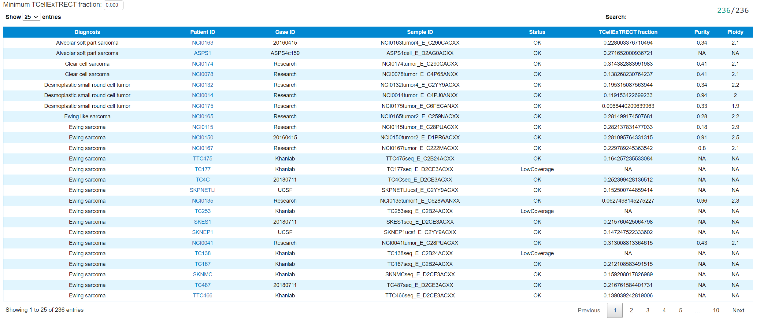 This tab shows the table summary of the T-cell infiltration using TcellExTRECT. The detailed explanation of the content can be found in case wiki page. The table can be filtered by the minimum T-cell fraction.