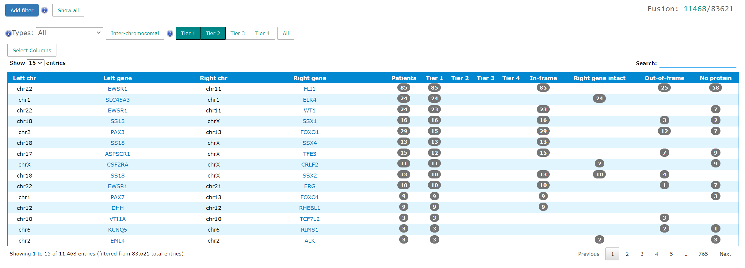 The project level fusion tab summarizes all fusions found in the project. The loading time may be a bit longer if the number of fusions is big. In addition to the left/right gene names and chromosomes, the table shows the patient count grouped by tiering and fusion types. The detailed information is available in case wiki page.