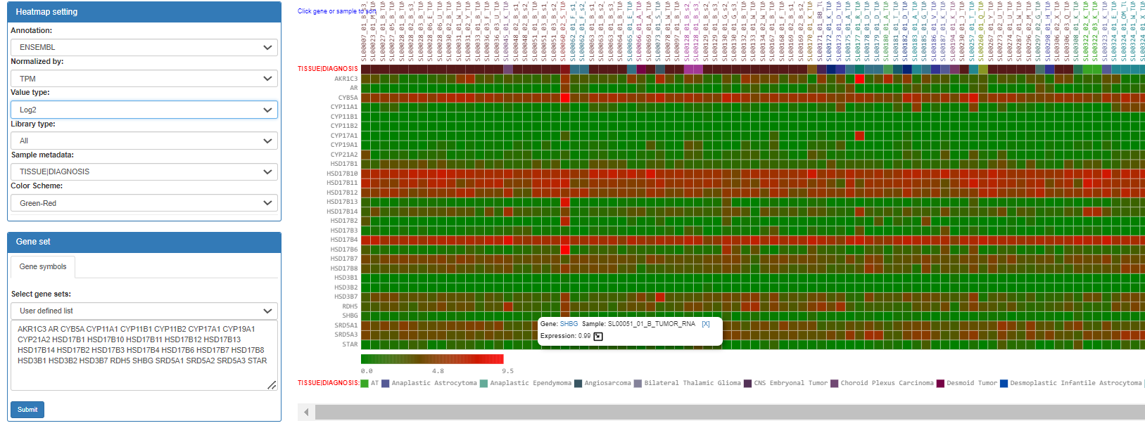 This tab shows the expression heatmap. User can switch the value types to TMM-normalized FPKM or TPM. The order can be sorted by either genes or samples by clicking them.