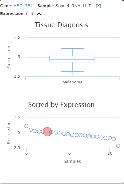 The pre-calculated PCA is based on 1000 genes with highest variants. The values are log2-CPM. This 3D plot can be colored by meta data. Users can also use z-scored or log2 values. Each dot represents an RNAseq sample. By clicking "show labels", the sample ID will be displayed. This might take a while if the number of samples is large. The loading and the total variance will also be shown on the side panel.