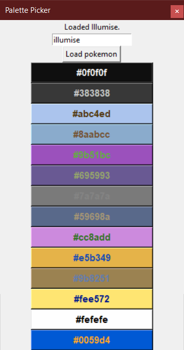 >>> pokepalette_viewer.view("torchic")There is also included a rudimentary "colour picker" GUI tool that displays all colours as clickable buttons, which copies the clicked hex code to your clipboard. Text entry box accepts both names and IDs.