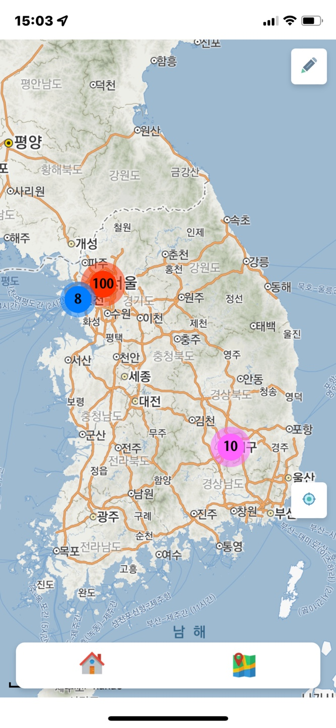 지도의 단계에 따라 해당 구역 별로 몇개의 도움글이 있는지 보여주고 해당 지역 클릭시 확대합니다.