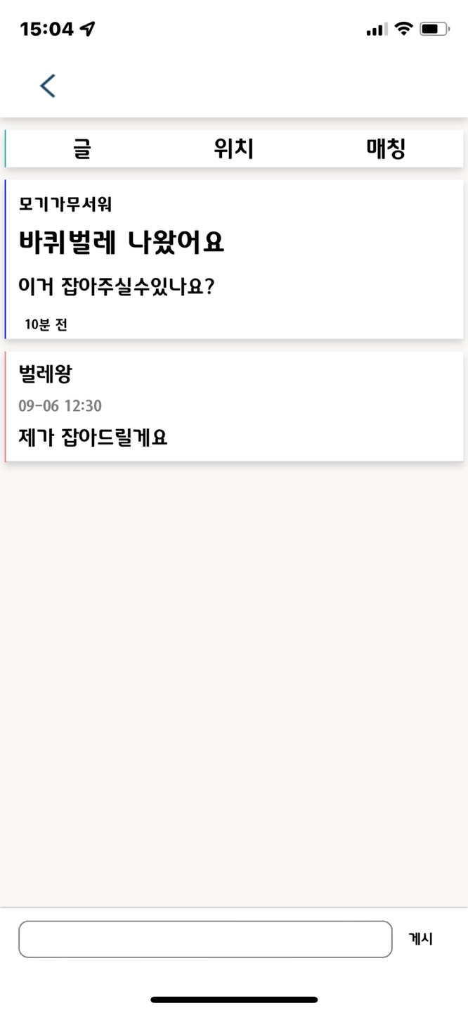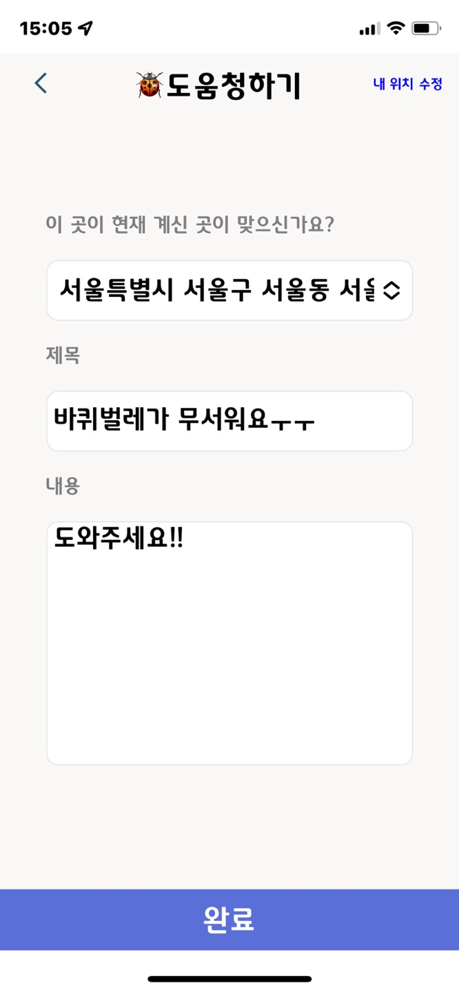 도저히 혼자 벌레를 잡을 자신이 없을 때, 벌레를 잘 잡는 동네 사람들에게 도움을 구할 수 있는 웹앱 서비스입니다.