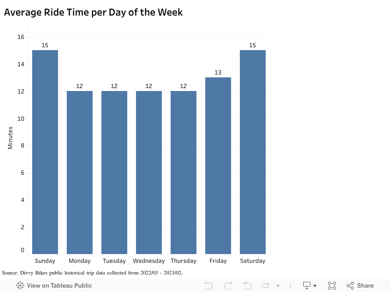 - The average ride time is much higher on the weekends than the weekdays.