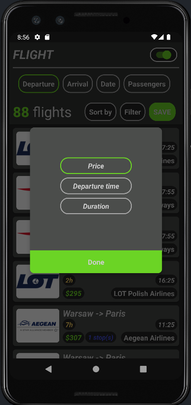 - Browse flights displayed by selected criteria