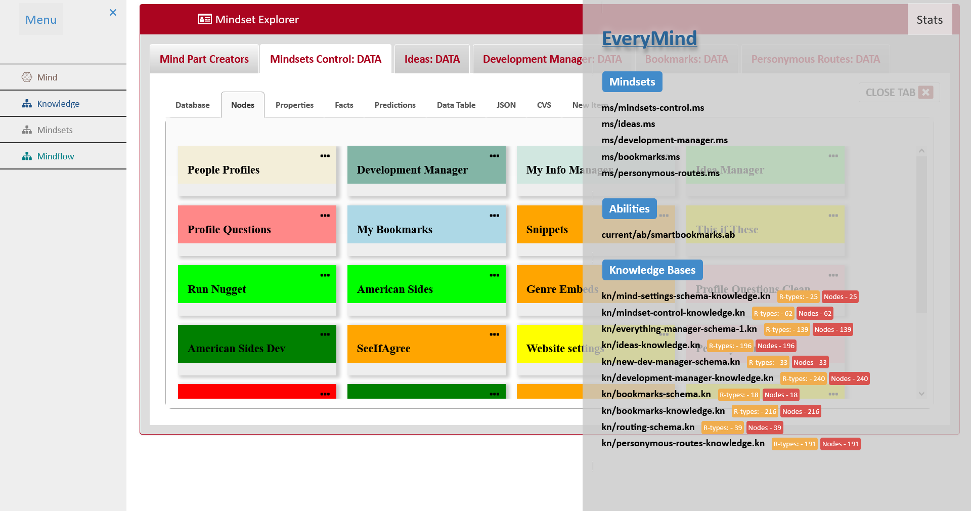 *** Mindsets and Abilities *** everyGraphs can be worked on individually, or can be associated with Mindsets. A mindset is a group of mind objects that work together - ussualy to perform a particular function or to construct an application. A mindset can include any number of graphs (knowledge libraries), any number of Schemas, and any number of Abilities (javascript objects). These were loosely pattern after componetns of the human mind: Knowledge, wisdom, Abilities, instincts, Intuition (prediction indexes). Mindsets and all associated mind objects can be dynamically loaded and referenced at run tiem.