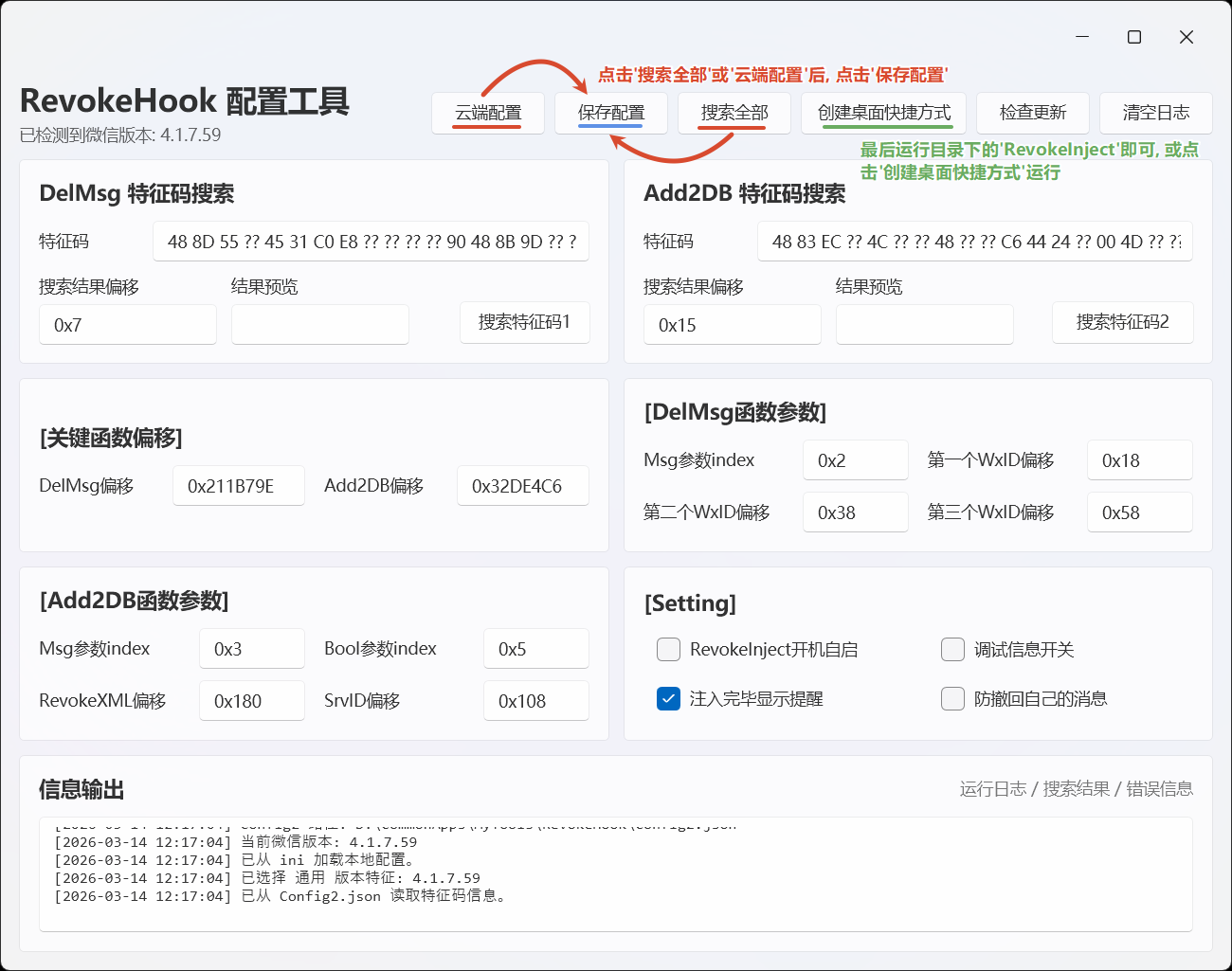 - 打开RevokeHookUI, 点击'搜索全部', 函数地址偏移将自动填充, 然后点击'保存配置'