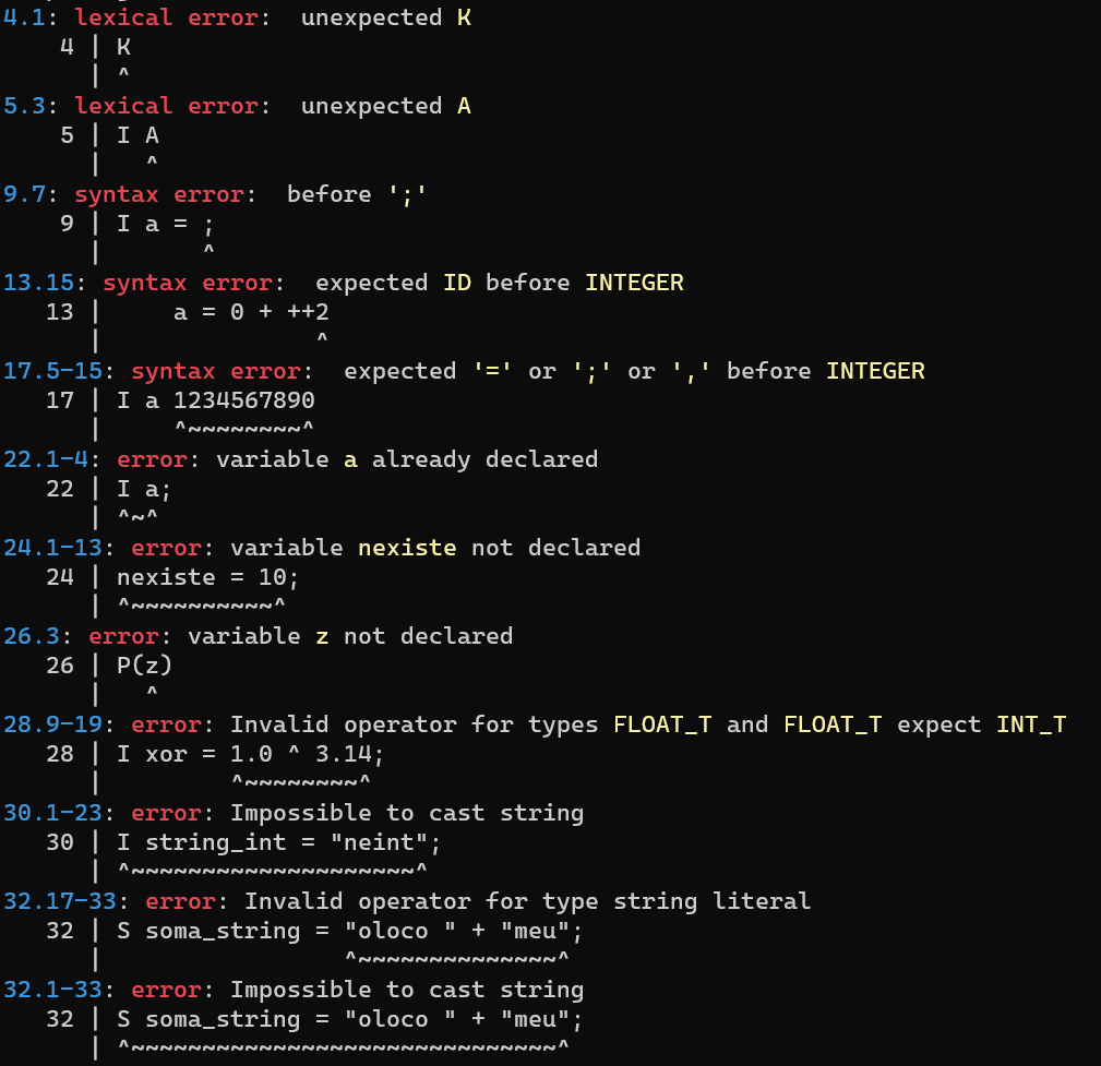 Abaixo segue um exemplo do reconhecimento de erros na compilação de um arquivo, pode se notar a implementação do sistema error recovery pois o compilador identifica mais de um erro por arquivo, por fim vale resaltar que todas as mensagens são de autoria dos autores alem dos sistema de coloração do erro, impresão da linha e contagem de linhas e colunas.