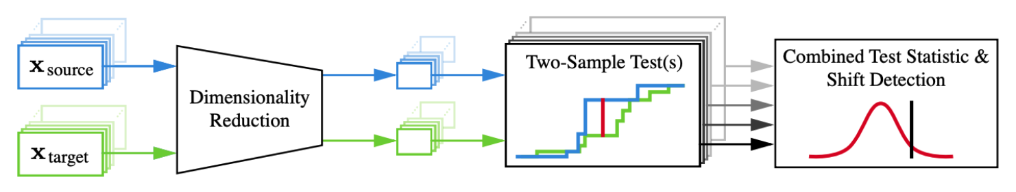 - Black box shift detectors (BBSD): the actual model trained on the training data can be used as a dimensionality reducer. We can either use the softmax outputs (multivariate) or the actual predictions (univariate).