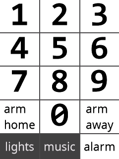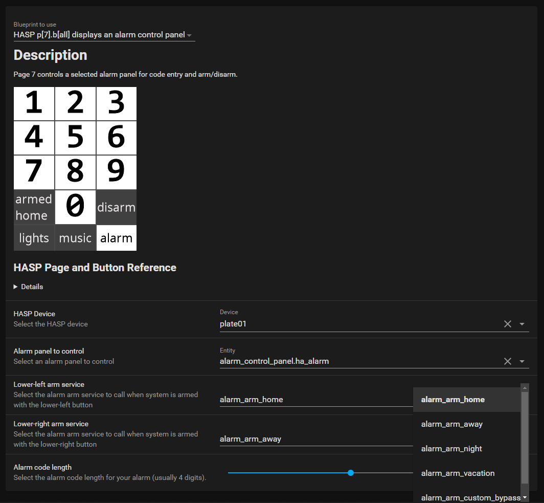 The new blueprint works much like the old version, but this time you have two pull-down select menus which allow you to define two different "arm" actions which will appear on the bottom-left and bottom-right buttons. Once armed, the bottom-left button will show the current "arm" state while the bottom-right allows the user to disarm the system after code entry.