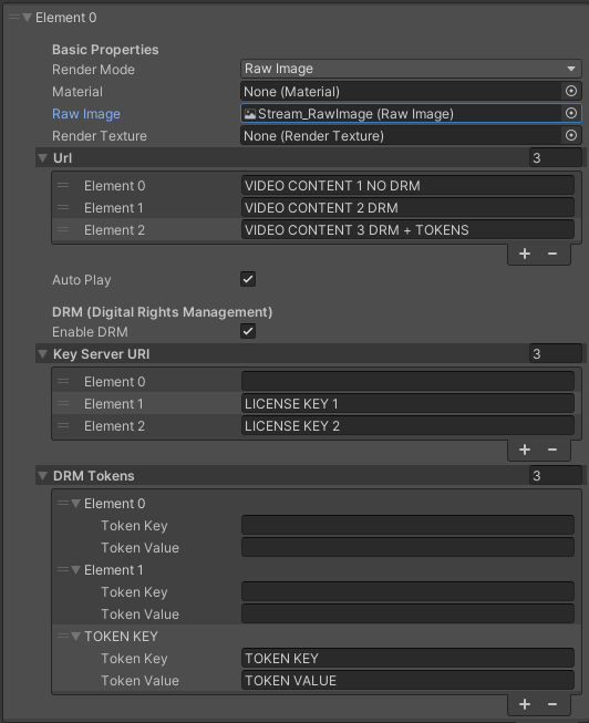 - DRM Tokens: If your key server needs more information, add drm tokens for DRM-protected contents alongside the respective Key Server URI. There must be one token per key server uri when the “Enable DRM” is checked. The tokens are composed of a Key and a Value. This field will have effect during the AddVideoContent functionality.