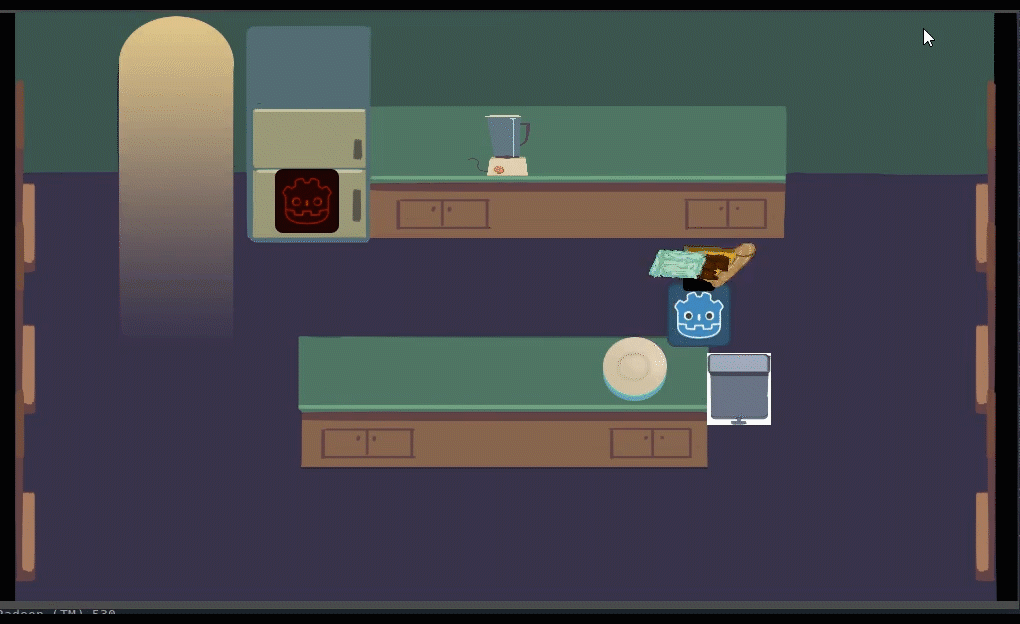 - Interact with various stations around the room: Refrigerator, Trashcan, Sandwich, and Blender station