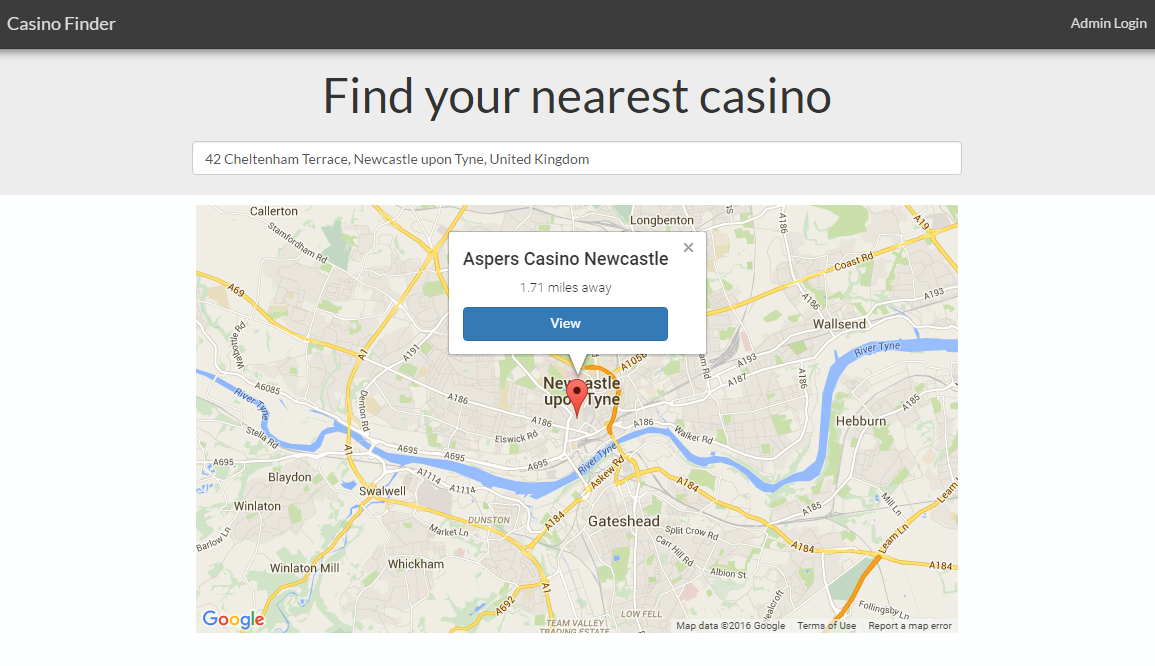 Casino Finder allows users to view casinos on a map, as well as finding the nearest casino to their location (based either on geolocation or a provided address). A CRUD backend is included, and as an administrator you are able to add/edit/delete casinos, along with their location and opening times.
