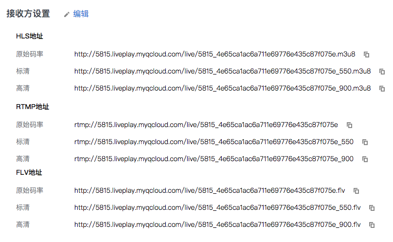 上面的示例代码只有一种清晰度,如果要添加多个清晰度,也非常简单。以直播为例,打开直播控制台,找到需要播放放的直播流,进入详情。