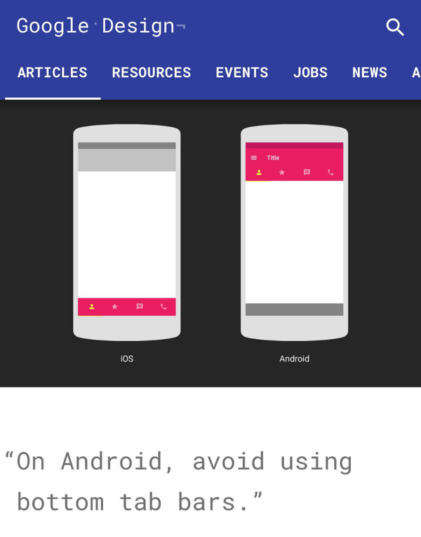 我们说说Drawer navigation,不要觉得疑惑,关Drawer什么事?没错,就是和它有关,认真想想,使用Drawer切换视图时,使用方式是点击按钮或者手势滑动打开,然后才选择跳转的Item,虽然节省了手机视图空间,但是操作较不方便以致使用率低,从而降低其他页面的跳转率这个缺点是不能忽视的。 所以说,相对于Drawer navigation,Bottom navigation就有优势了。