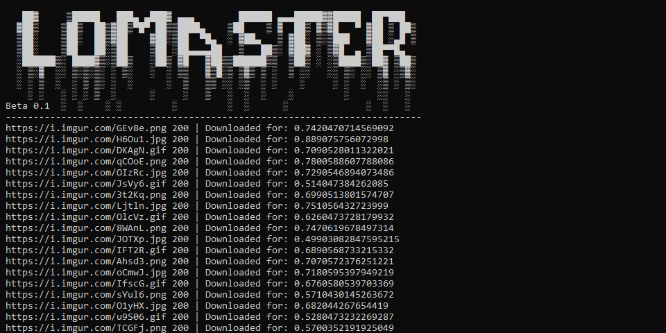 ImgurParser 0.1 Parser photo from imgur, Available formats: jpg, png, gif. Speed: 1m/80 photo. Downloads photos: to the root folder. Output Format: URL - STATUS - TIME Install win, linux and termux: git clone https://github.com/Lomasterrrr/ImgurParser.git pip install requests cd ImgurParser-main python main.py