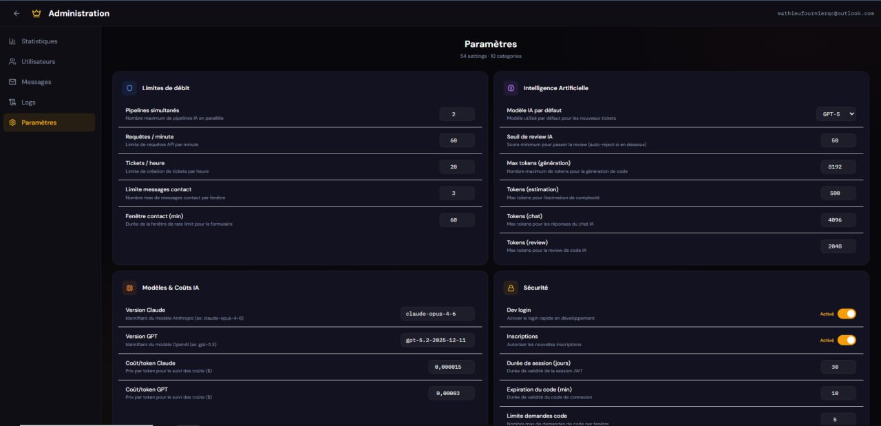 - 51 settings admin — Configuration granulaire du pipeline, modèles AI, limites, comportements