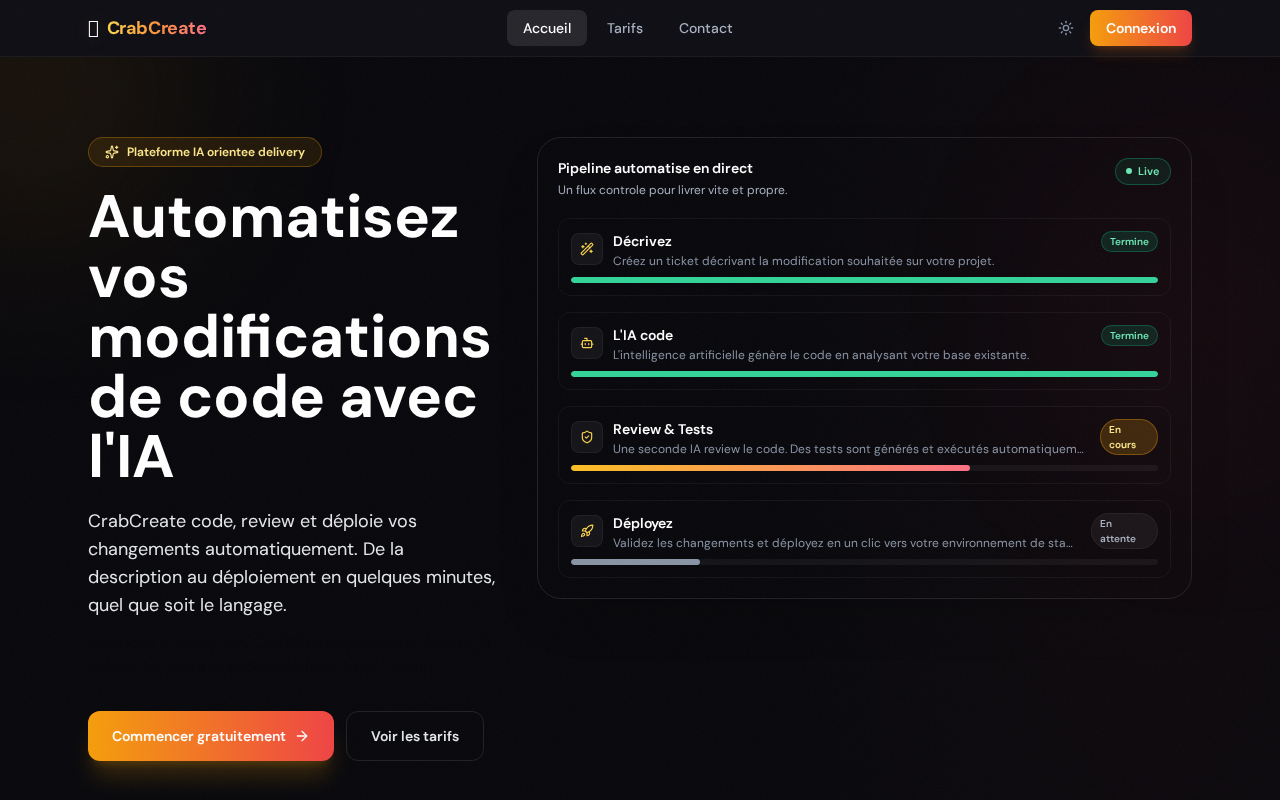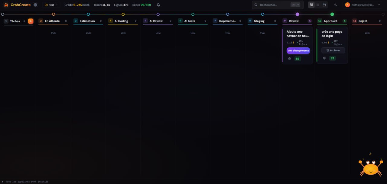 Dans un contexte de maintenance d'applications legacy, les modifications manuelles sont lentes et error-prone. CrabCreate transforme un ticket Kanban en code fonctionnel : l'IA (Claude/GPT) analyse la codebase existante, génère les modifications, les pousse sur le dépôt Git, lance une review automatique et déclenche le déploiement — le développeur n'a qu'à valider.