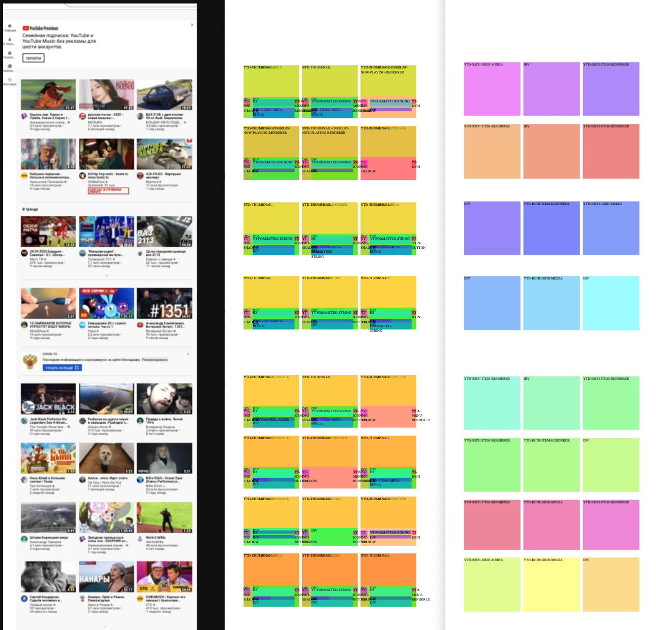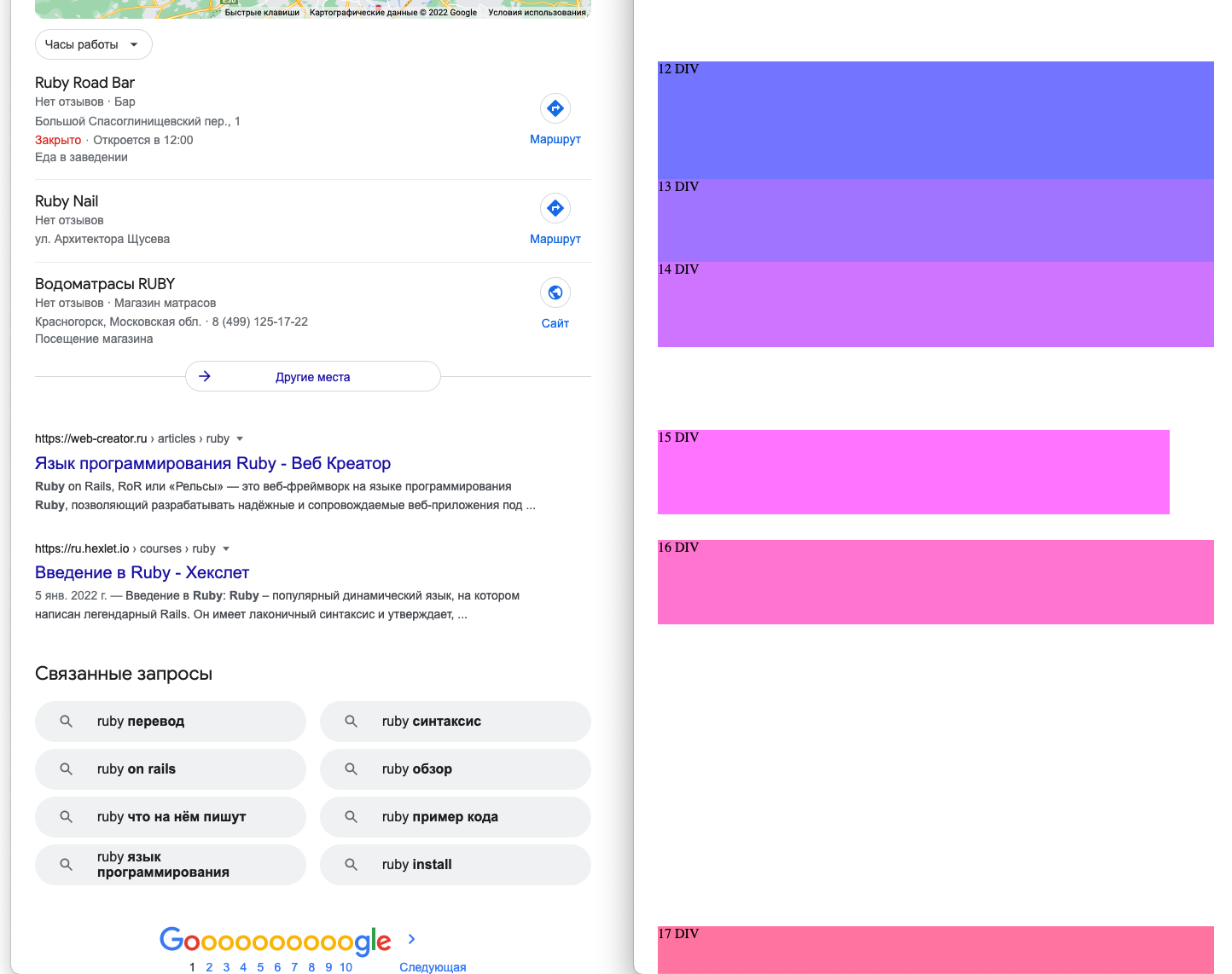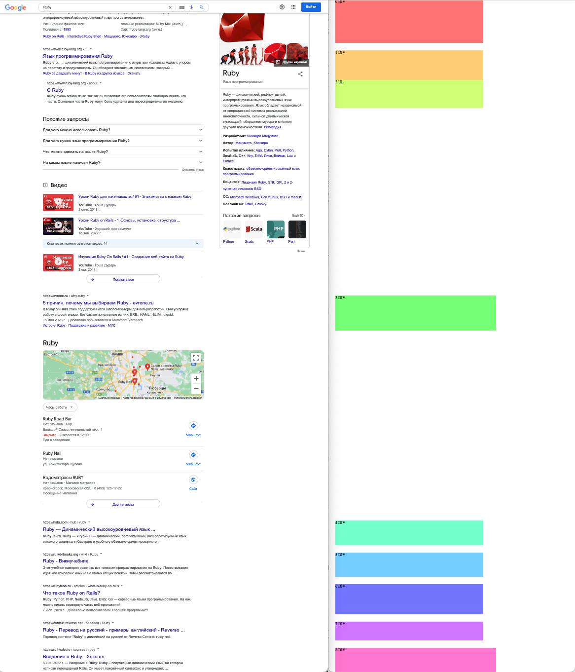 The Google Search page is complex today and as you can see with the default options it did not recognize the first result and misrecognized others. The misrecognized ones either have no blue hyperlinks or no text at all. What can we do? Each recognized node has a method #texts that allows us to access the text blocks and their style. It also recognizes text color classifying it based on 16 Basic Web colors. Let's use it and add a custom euristic that would give a hint to process only such nodes that contain black and blue text: