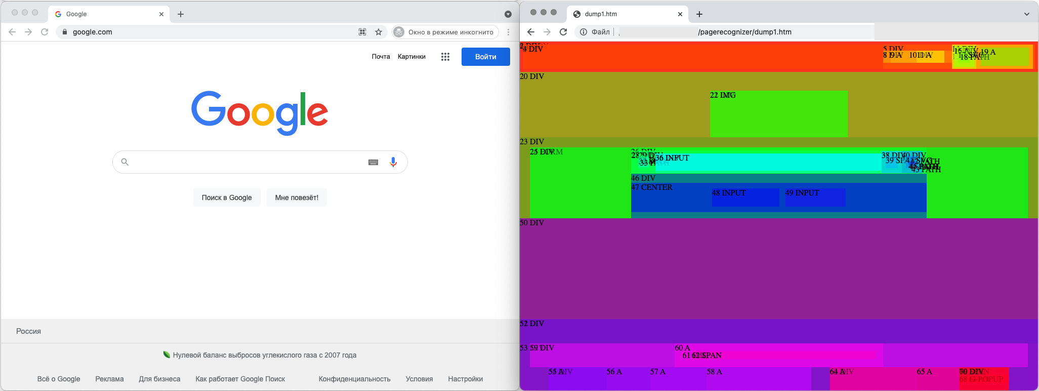browser.goto "https://google.com/"We've just added some methods to Ferrum::Node, let's call the private method #recognize to export what the A.I. would see to an HTML file like this:
