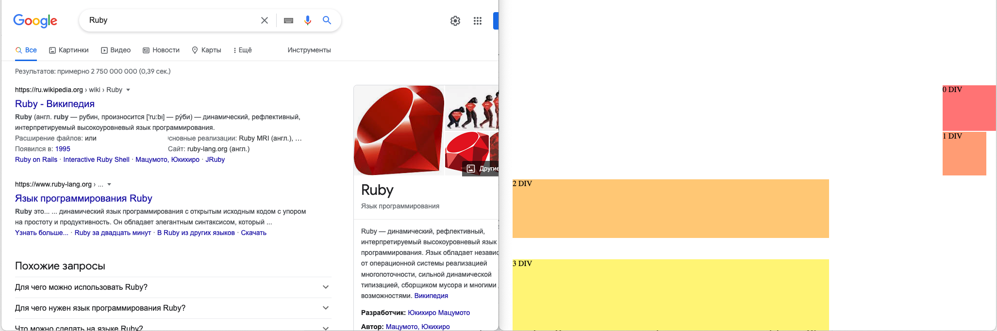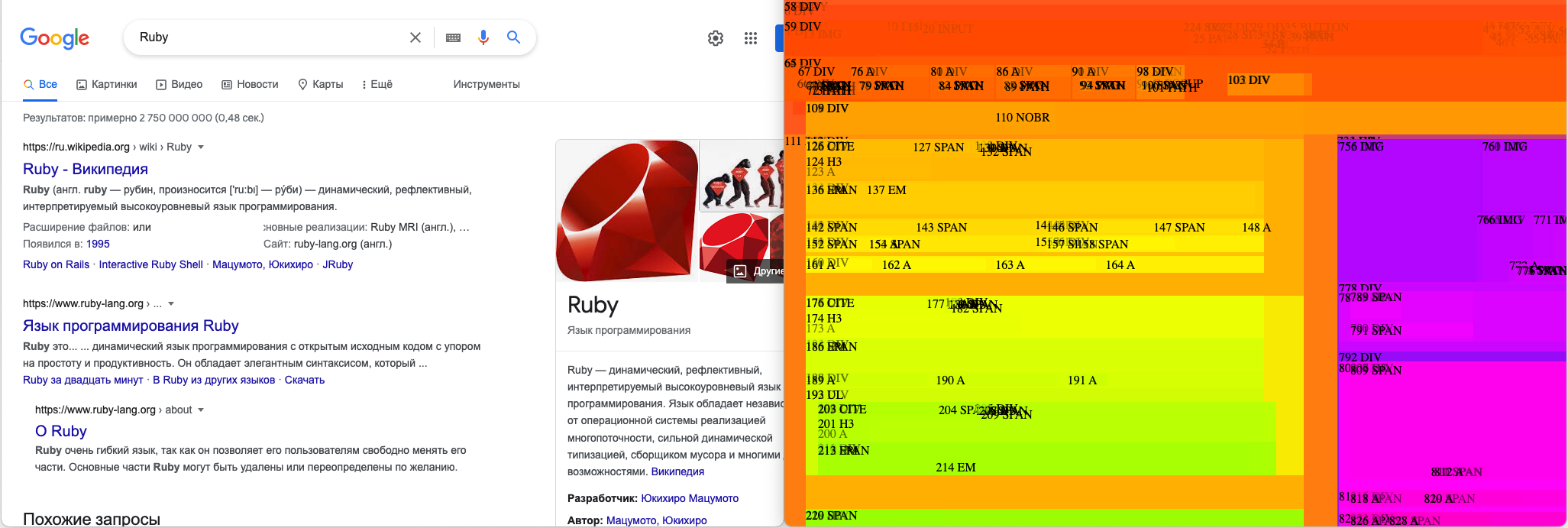 File.write "dump.htm", browser.at_css("body").send(:recognize).dumpThis is a nodes rects view that the A.I. will use later for the recognition. Let's do a web search and see what it sees now: