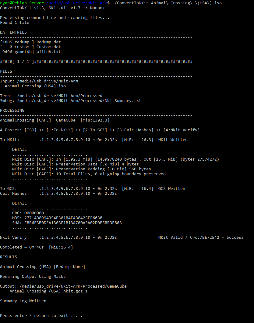 Just a quick update. I've successfully compiled ConvertToNkit for ARM on Linux, and tested it with Animal Crossing GC. The compile command was: The output summary from the test is: |