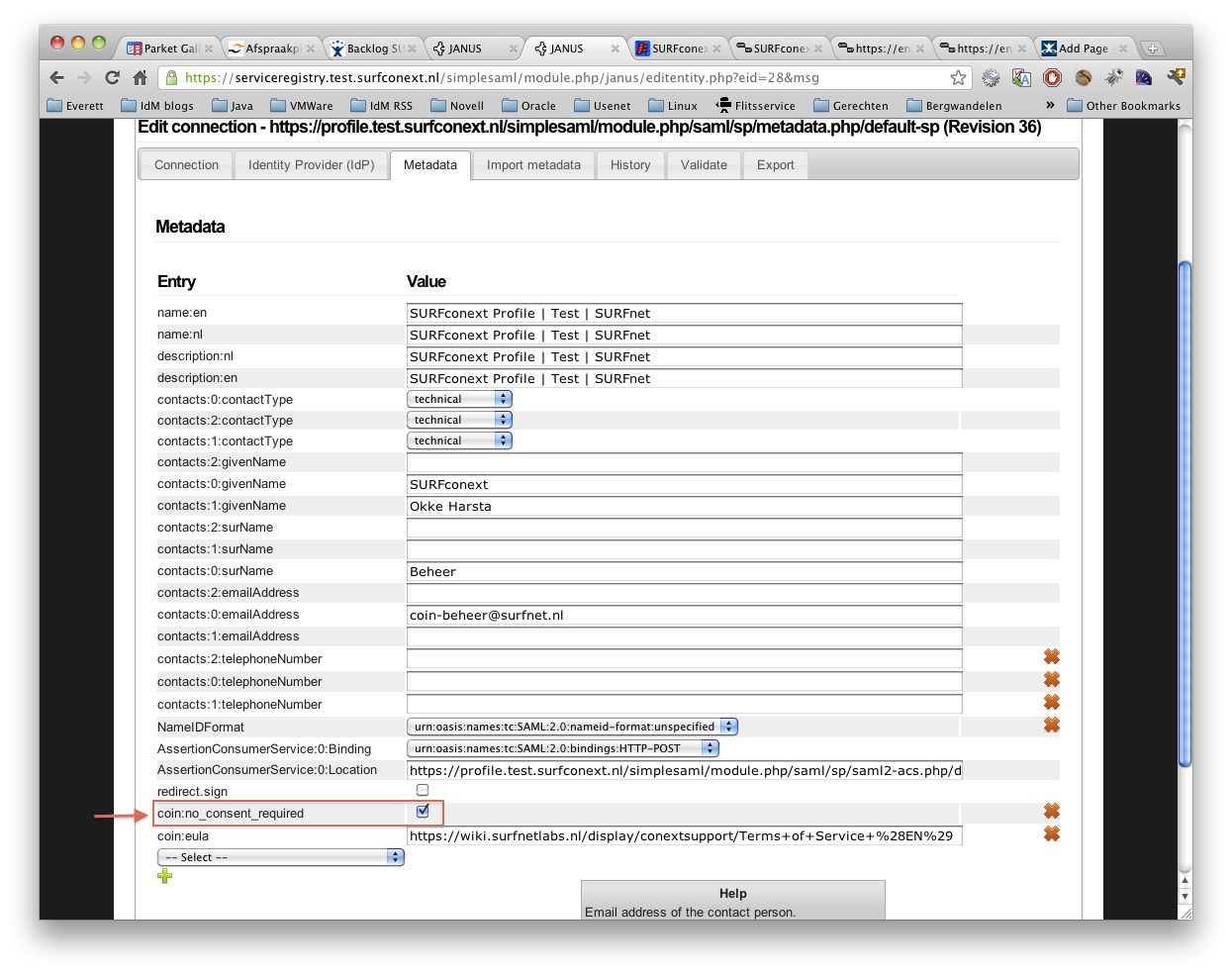 For certain SP's it should not be necessary to provide consent. This can be configured in the ServiceRegistry by adding an attribute to the SP for which you want to disable consent. To disable consent, add the coin:no_consent_required attribute by clicking on the "coin:no_consent_required" box on the Metadata screen, as shown in the screenshot below.