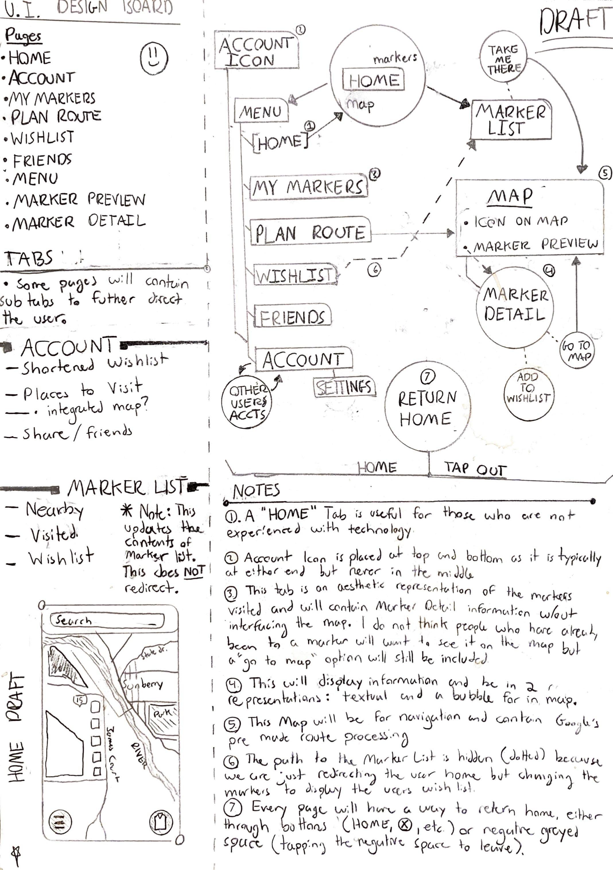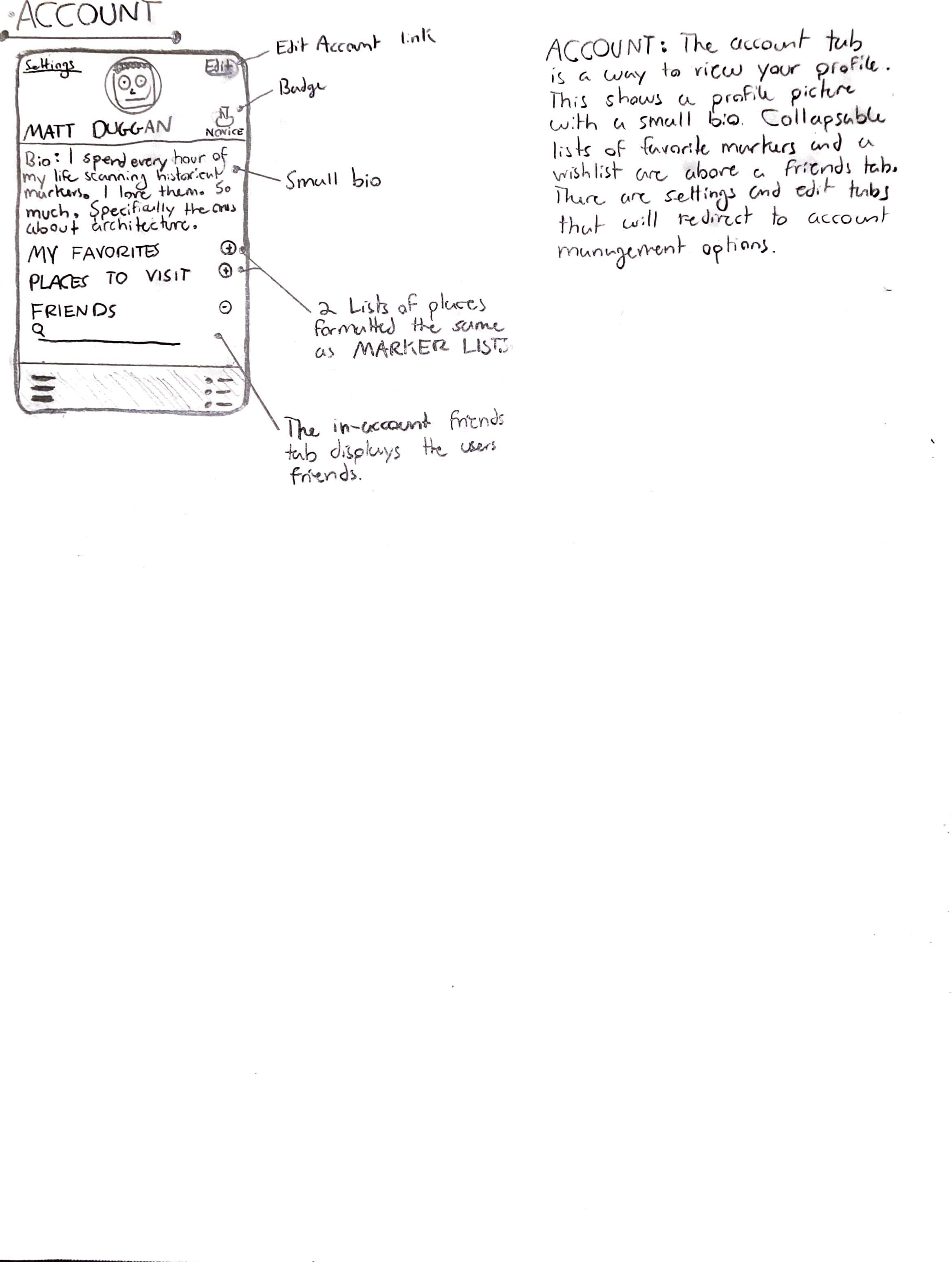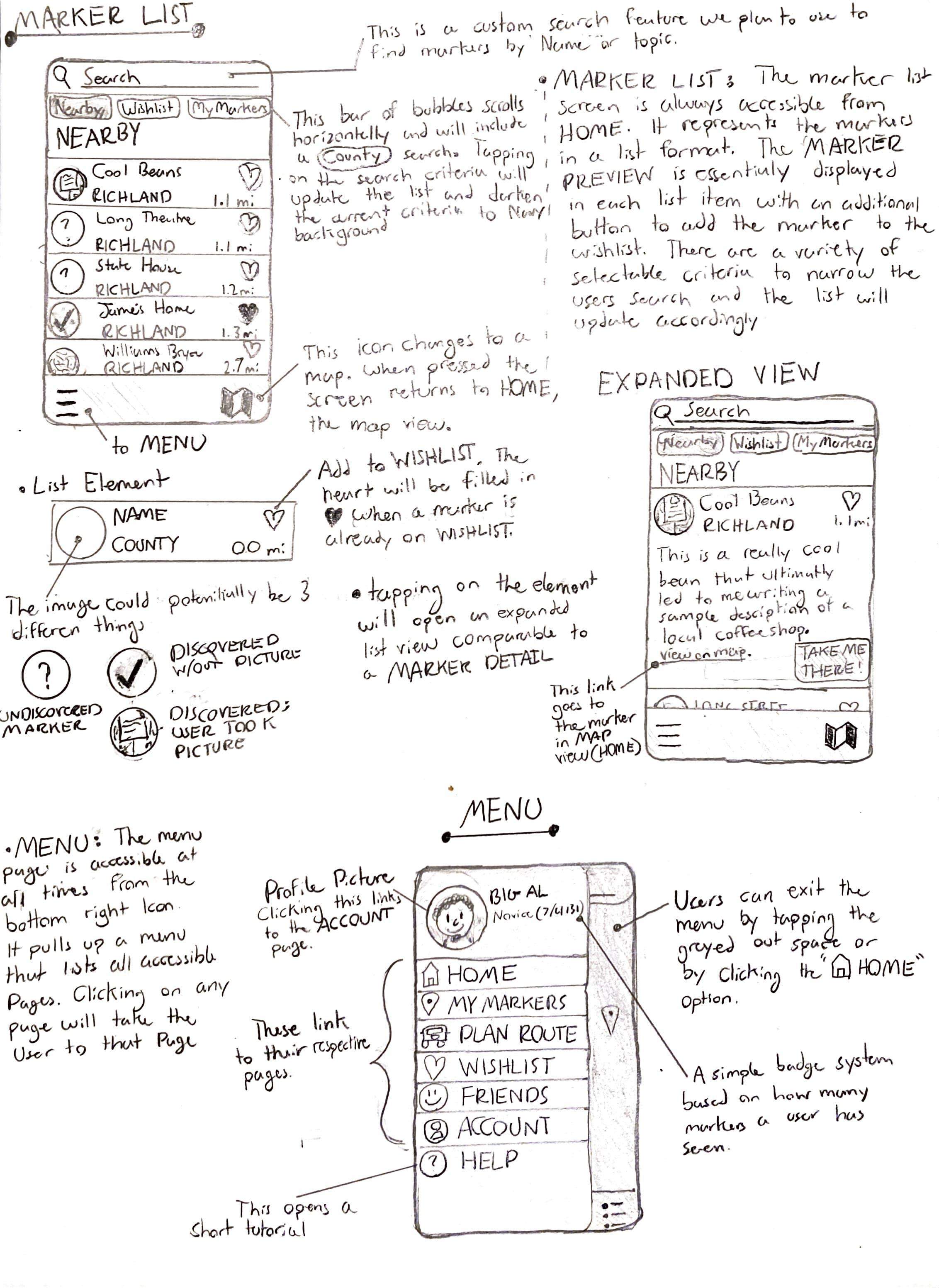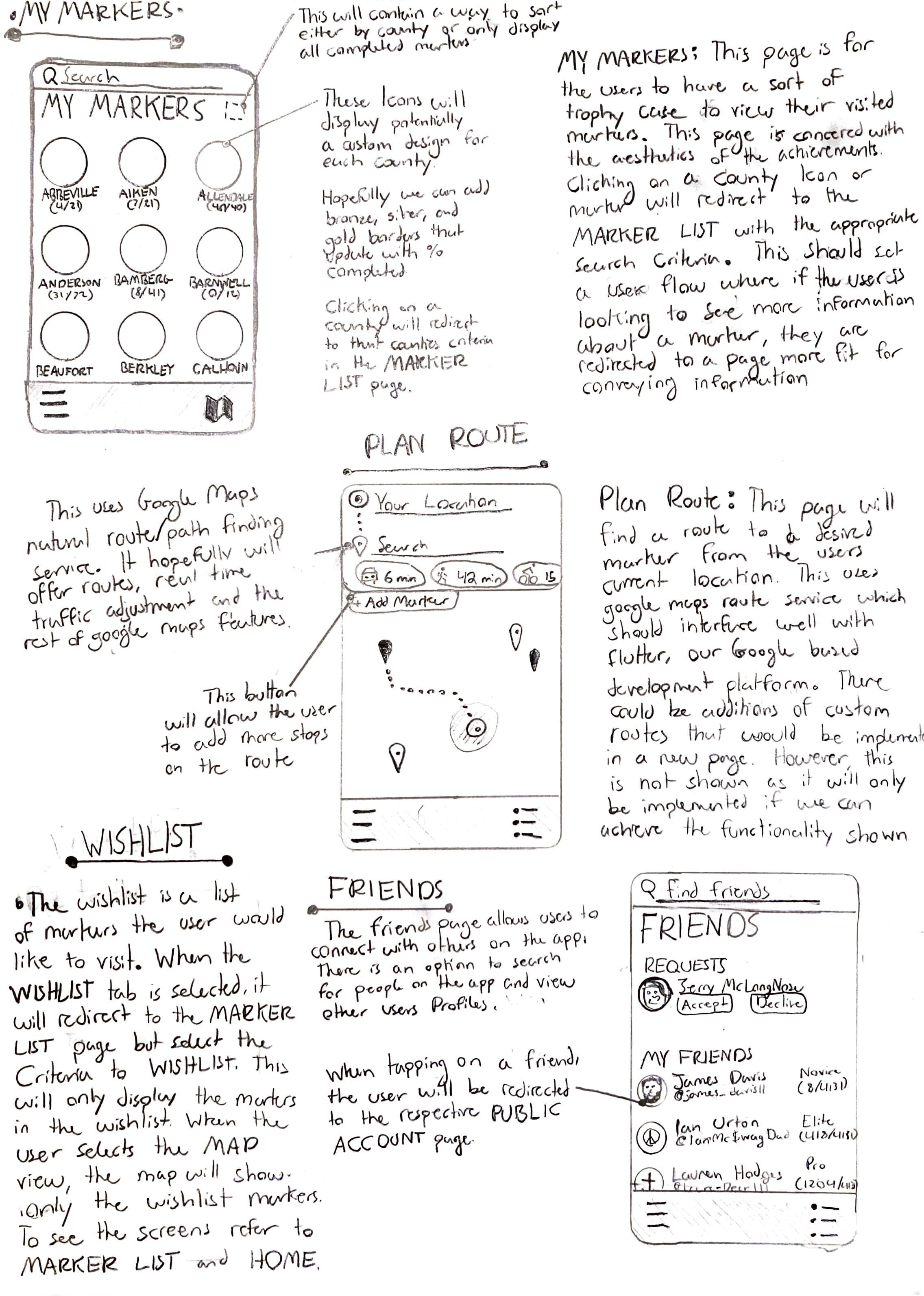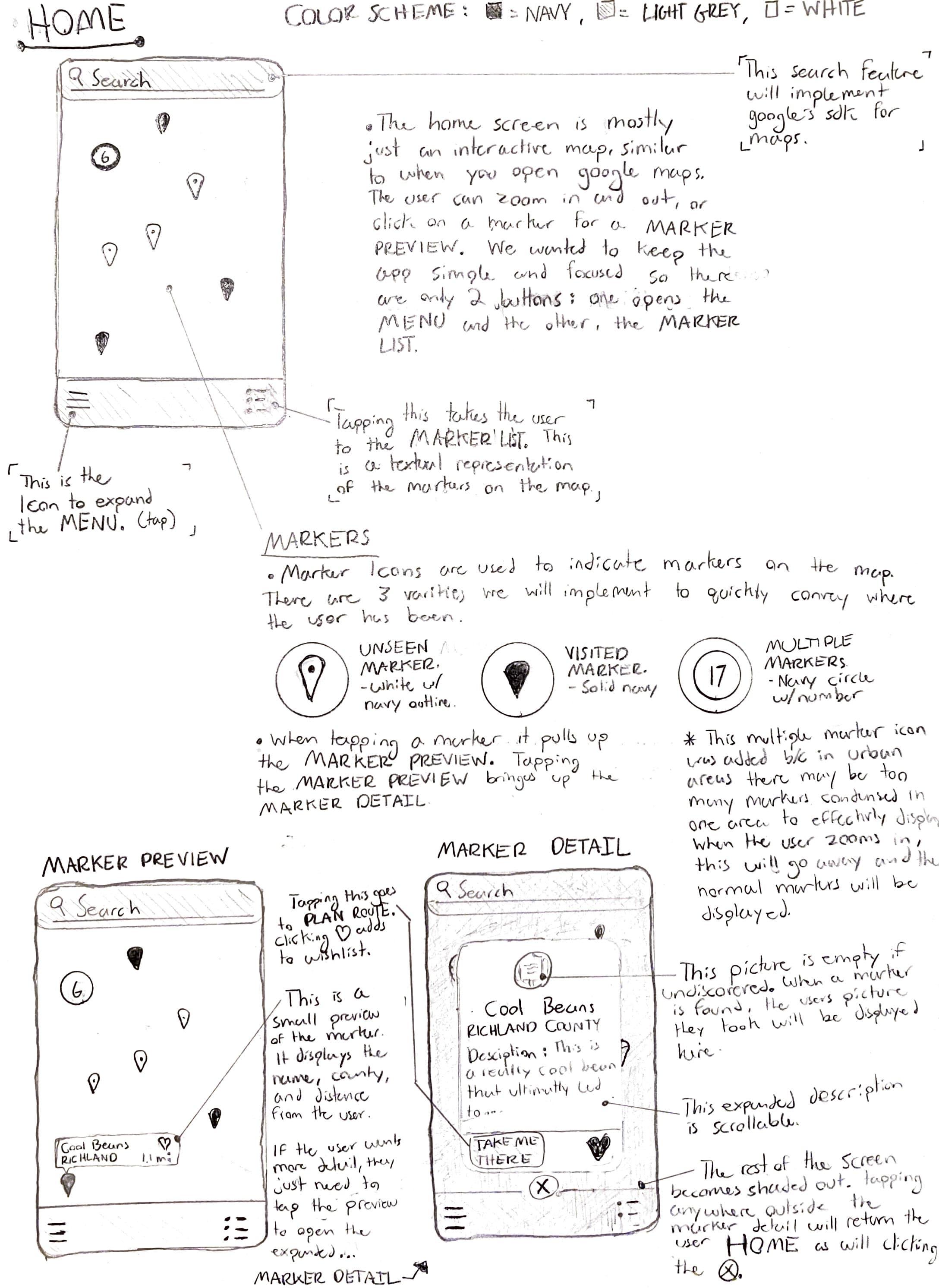 These are the designs for our UI. The first four pages represent the final design pages drawn by hand and the last page is the outline and draft that we began with. We are working on implementing this into a fully functioning project in proto.io. In designing the UI elements we took inspiration from Seek, Spotify, Google Maps, and Louisiana Historical Markers iOS apps.