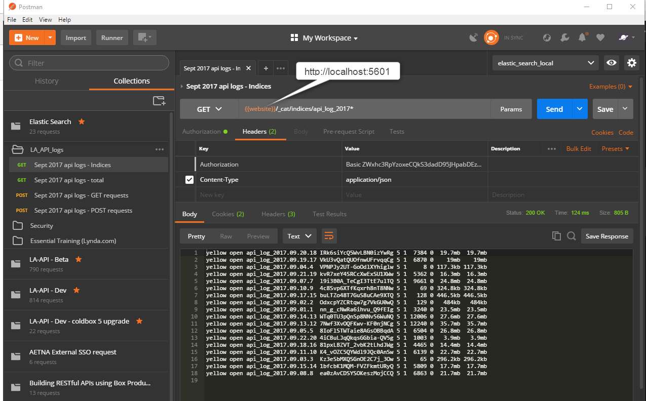 Using Postman or the Kibana interface, perform a call against the api_log index pattern to verify that upload was successful