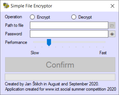 The application uses an improved version of Vigenère cipher to encrypt and decrypt the data. That means, that it uses your password to encrypt and decrypt the data. The password itself is encrypted by a different method before using it to assure even higher security. Both the file and the password is then converted into series of bytes (numbers between 0 and 255 inclusive) and are added together. Decryption works the same, but the byte values are subtracted, not added.