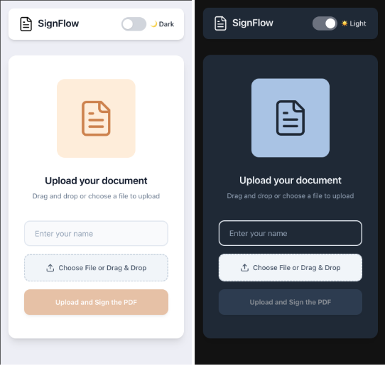 SignFlow is a full-stack prototype that lets users upload PDFs, sign them digitally, and download the signed document—all through a clean, responsive interface. Built as a monorepo with a React + TypeScript frontend (powered by Vite) and a lightweight Express.js backend, it's designed to showcase solid architecture, thoughtful UX, and production-ready patterns.