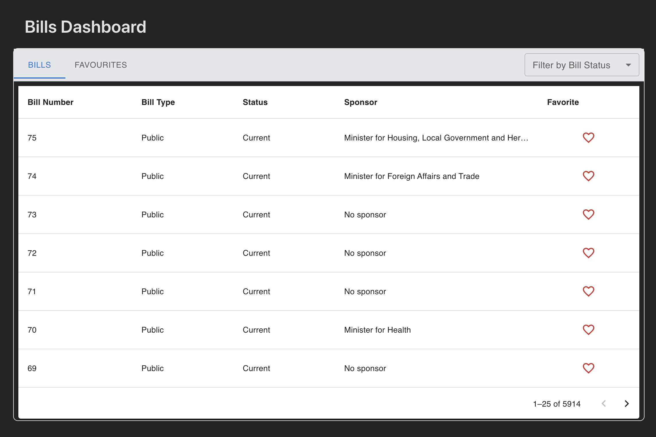 A React application that allows users to view and manage bills from the Oireachtas API. Users can filter bills, view details in English and Irish, and mark bills as favorites.