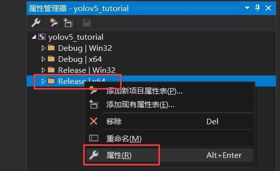 点击视图=>其他窗口=>属性管理器,在Release | x64(与上面编译过程中的参数对应)处右击进入属性界面。