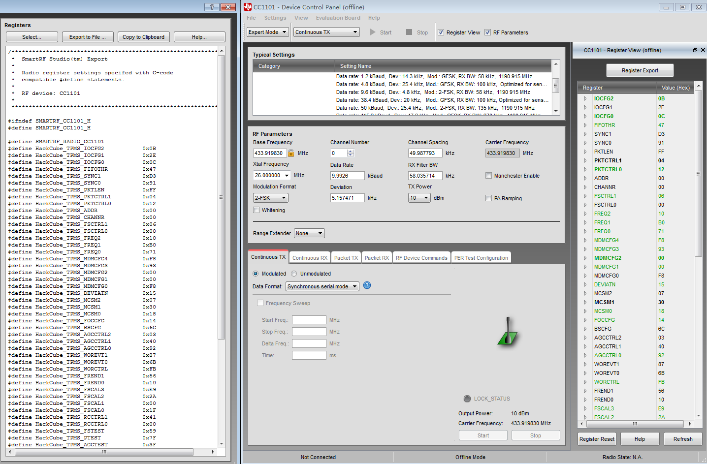 这个是根据胎压传感器信号生成的CC1101寄存器的配置,可以通过SmartRF Studio配置完参数后导出,不过有些寄存器是不支持IDE去进行设置的,必须是根据芯片的datasheet去修改的,比如说让射频芯片处于异步模式,切换射频芯片的工作状态等等.