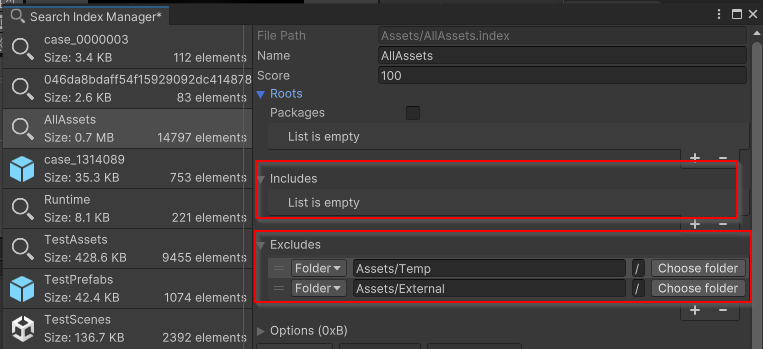 Sub objects (or extended in 23.X): this means that all objects contained in an asset will also be indexed. Concretely: all objects within prefabs and scenes will be indexed. This allows for offline search of scene. But this comes at a high cost because scene can contain LOTS of objects. I suggest that for medium or big project you disable this option.