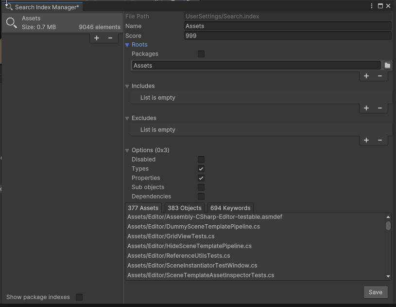 When you first open the Search Window in a new project, we create a default index file in your UserSettings folder. This file defines how indexation should be performed.