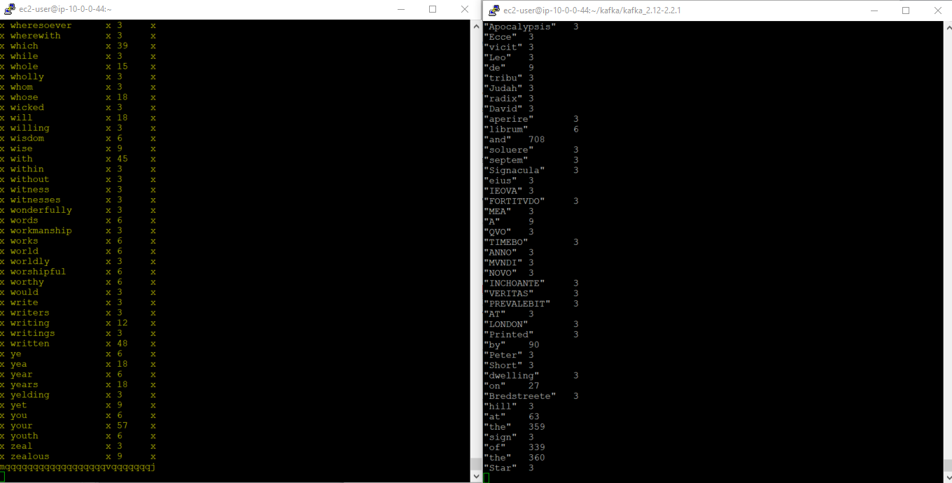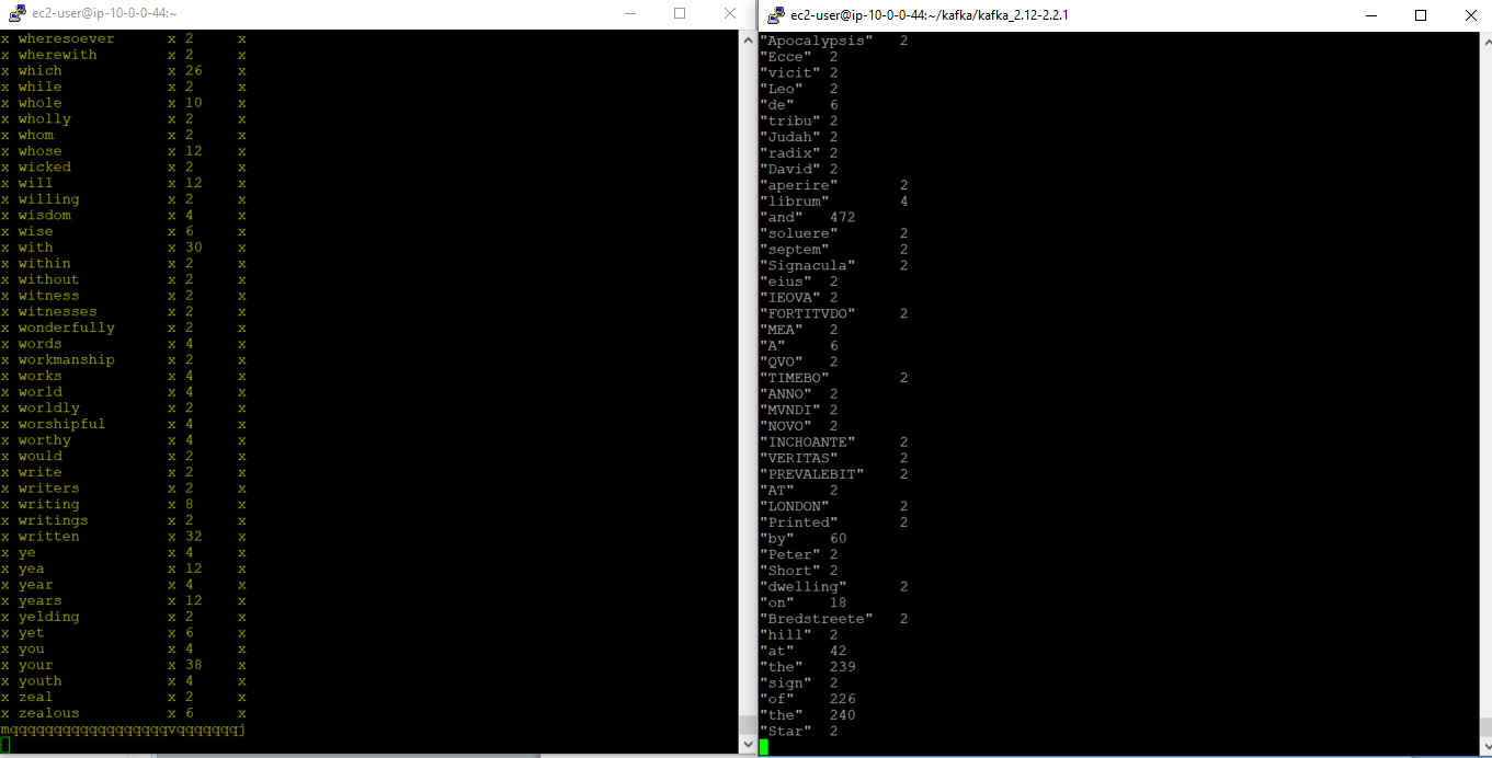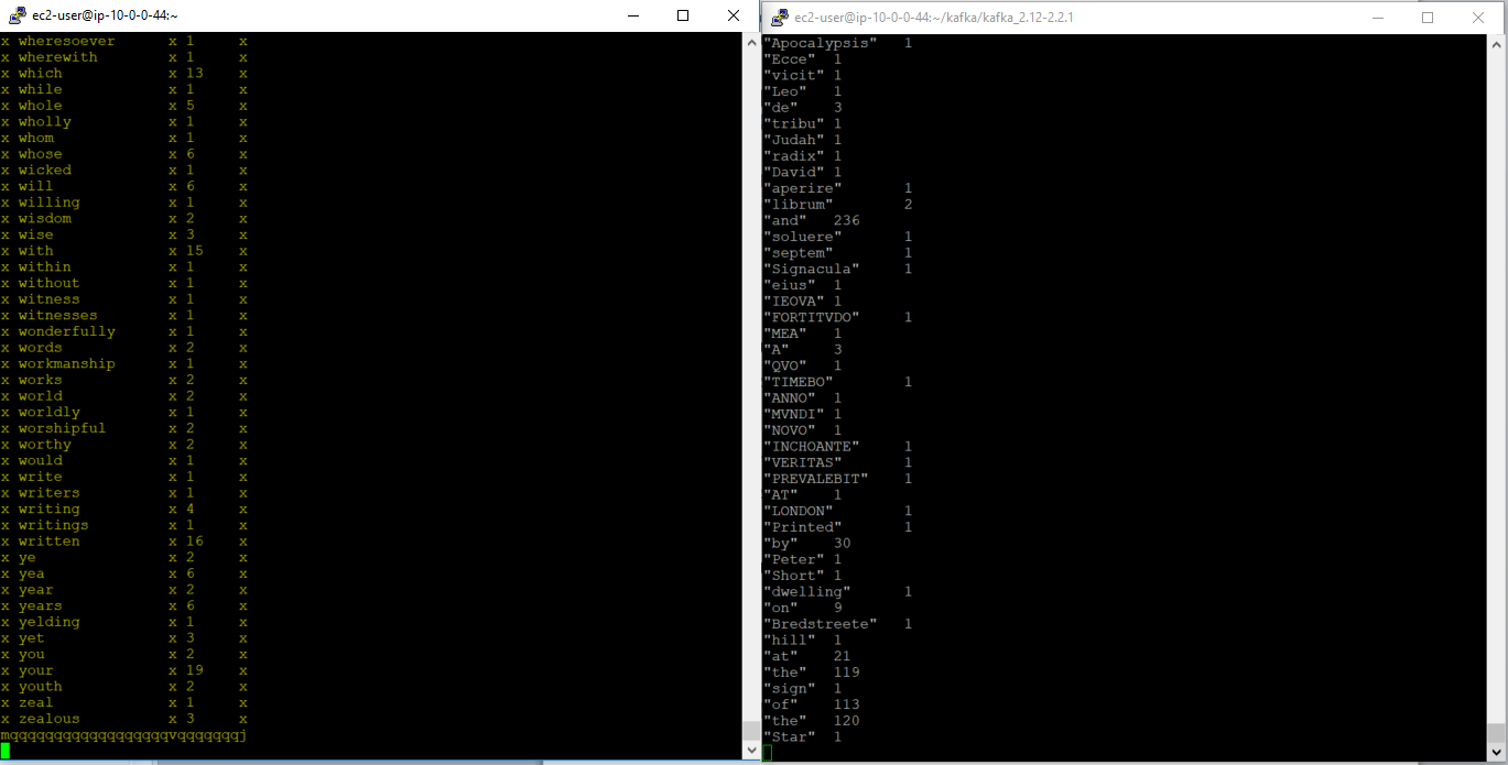 bin/kafka-console-consumer.sh --bootstrap-server localhost:9092 --topic word-count-word_counts-changelog --from-beginning --property print.key=true --property print.value=true3- Put the Console Consumer window to the right of the Producer and Upload file A1.headed.txt to the S3 bucket.