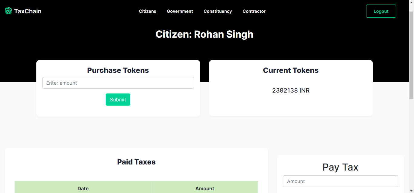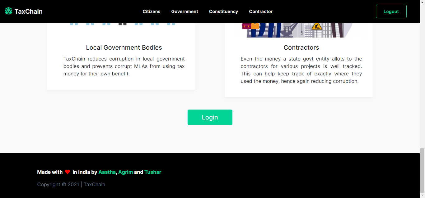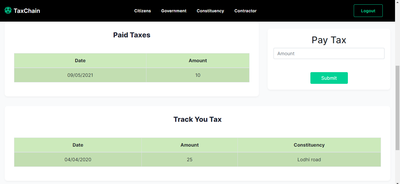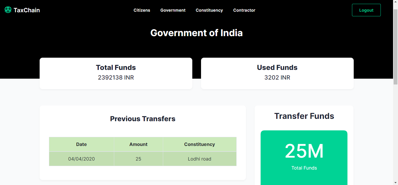 We are worked on solving the problem of corruption and creating transparency in the country’s taxation system using Blockchain Tech. In the past few days we have seen the central government and state governments fighting over the shortage of supplies due to Covid. While the government's claim to be working citizens are unsure where their tax money is being used. Our idea is revolutionary as it will make this entire procedure transparent.