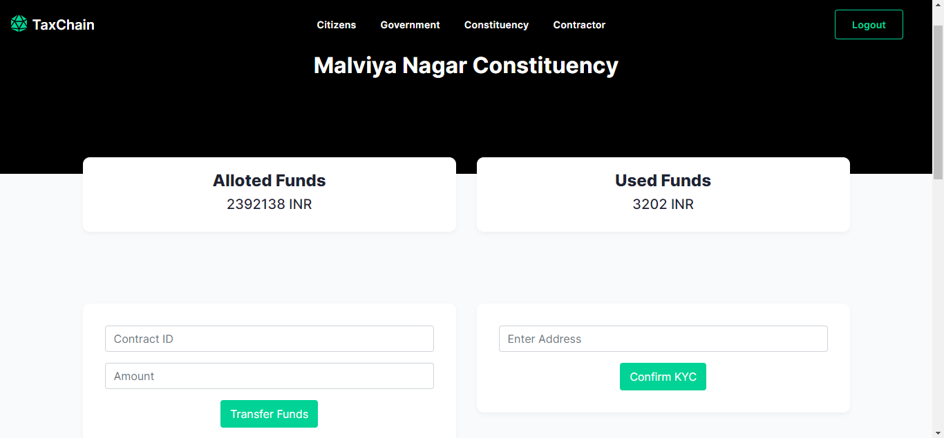 The main stakeholders in our idea are the Citizens, the government, constituencies and contractors. The government allocates funds to MLAs to work in their constituencies however often due to corrupt leaders and corruption at every stage in the process the money is not utilized properly for the citizens. We have decided to make the entire procedure transparent from paying taxes to where your money is being used by the government and constituencies, and from constituencies to contractors.