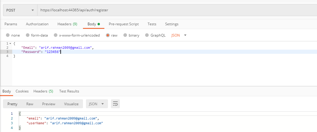 app.UseCors(x => x.AllowAnyOrigin().AllowAnyMethod().AllowAnyHeader());Add LoginDto.cs & RegisterDto.cs in Dtos folder and AuthController.cs in Controller
