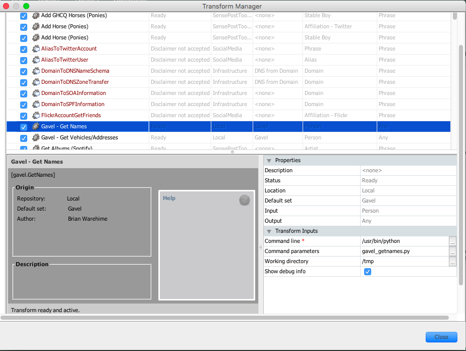 To make sure these transforms run correctly, we'll need to set up your environment. Click on "Manage Transforms" in the menubar and it'll open the "Transform Manager". Next, scroll down until you find the Gavel transforms. Click on the first one and look at the bottom right of the window. You'll see a few options like so: