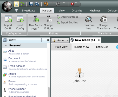 To use Gavel, you'll simply download the code we provide and import the transforms into Maltego. Once all the code is set up and in the right place, you would then just add a "Person" entity in your Maltego graph like so...