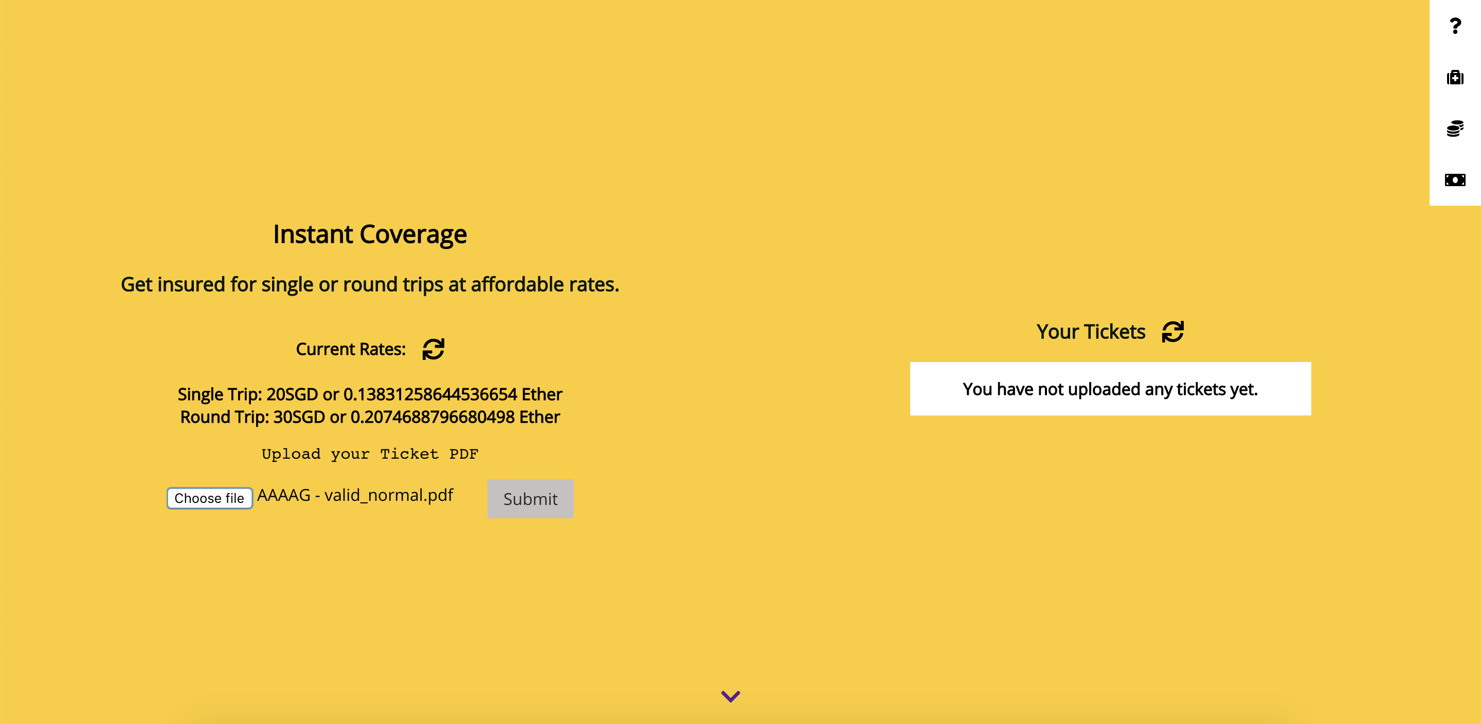 Upload some tickets. We have provided some handy ones in the project, in /tickets. You don't need to fill in Add Return Trip Ticket for Single Trips. AAAAA, AAAAG, AAAAI and AAAAK are valid single trip tickets.