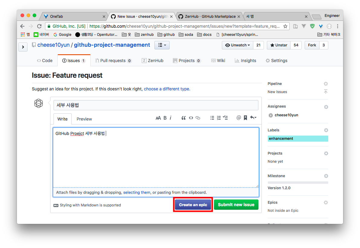 물론 GitHub에서 제공해주는 Project도 칸반보드를 제공해주어서 대안이 되지만 여러 레파지토리에 대한 표시, 애픽 기능 등 다양한 기능들을 제공해주기 때문에 개인적으로 ZenHub를 추천해 드립니다.
