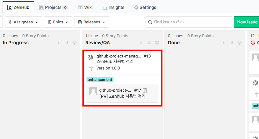 저 같은 경우에는 생각나는 모든 것들을 New Issue 항목에 추가하고 우선순위가 낮고 당장 필요 없는 작업은 Icebox, 우선순위가 높은 작업은 Backlog 항목에 넣습니다. 진행 중인 작업은 In Progress 나머지 Review/QA는 Pull Request 항목, Issue가 Close 되면 자동으로 Close으로 가게 됩니다.